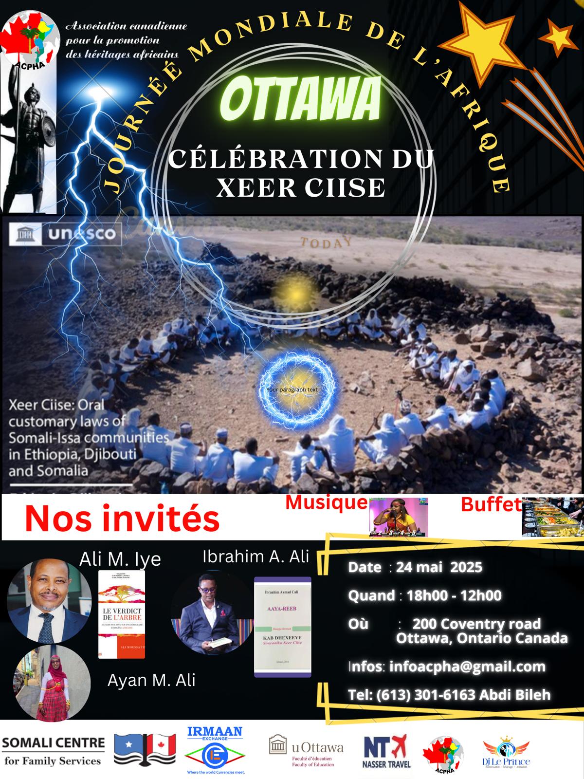 Préparez-vous à participer à un événement extraordinaire lors de la collecte de fonds de l'Association canadienne pour la promotion des héritages africains (ACPHA). Il s'agit d'un événement sans précédent, et nous voulons que vous y assistiez. Le xeer ciise fait référence au droit coutumier oral des communautés somali-Issa d’Éthiopie, de Djibouti et de Somalie. C'est un système de gouvernance démocratique très structuré et rigoureusement codifié. Il comporte trois composantes principales :